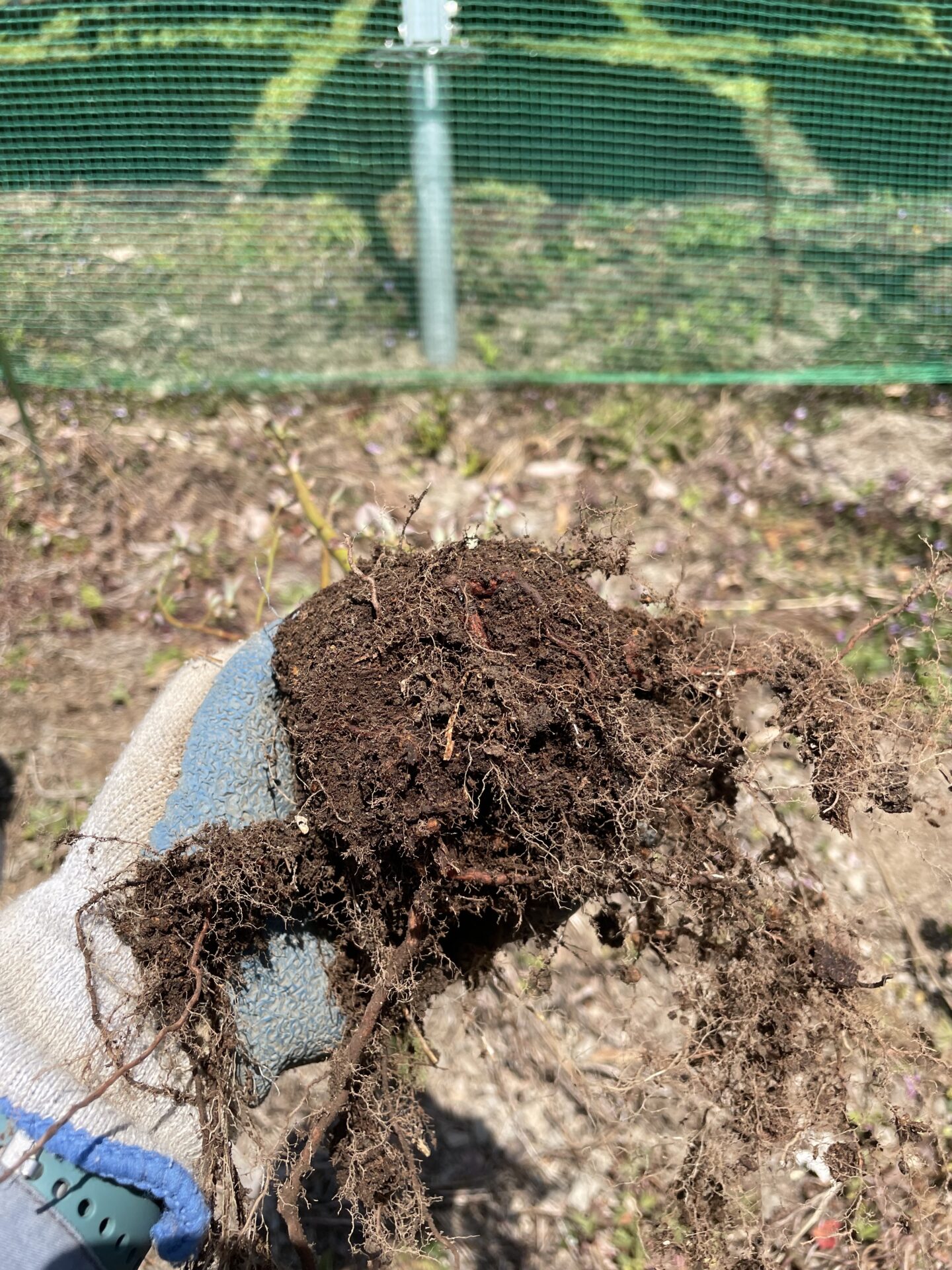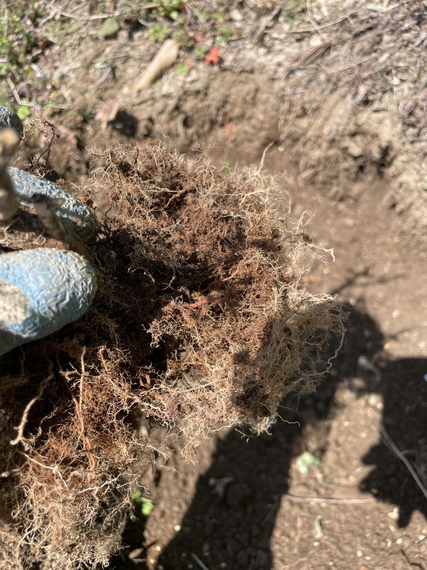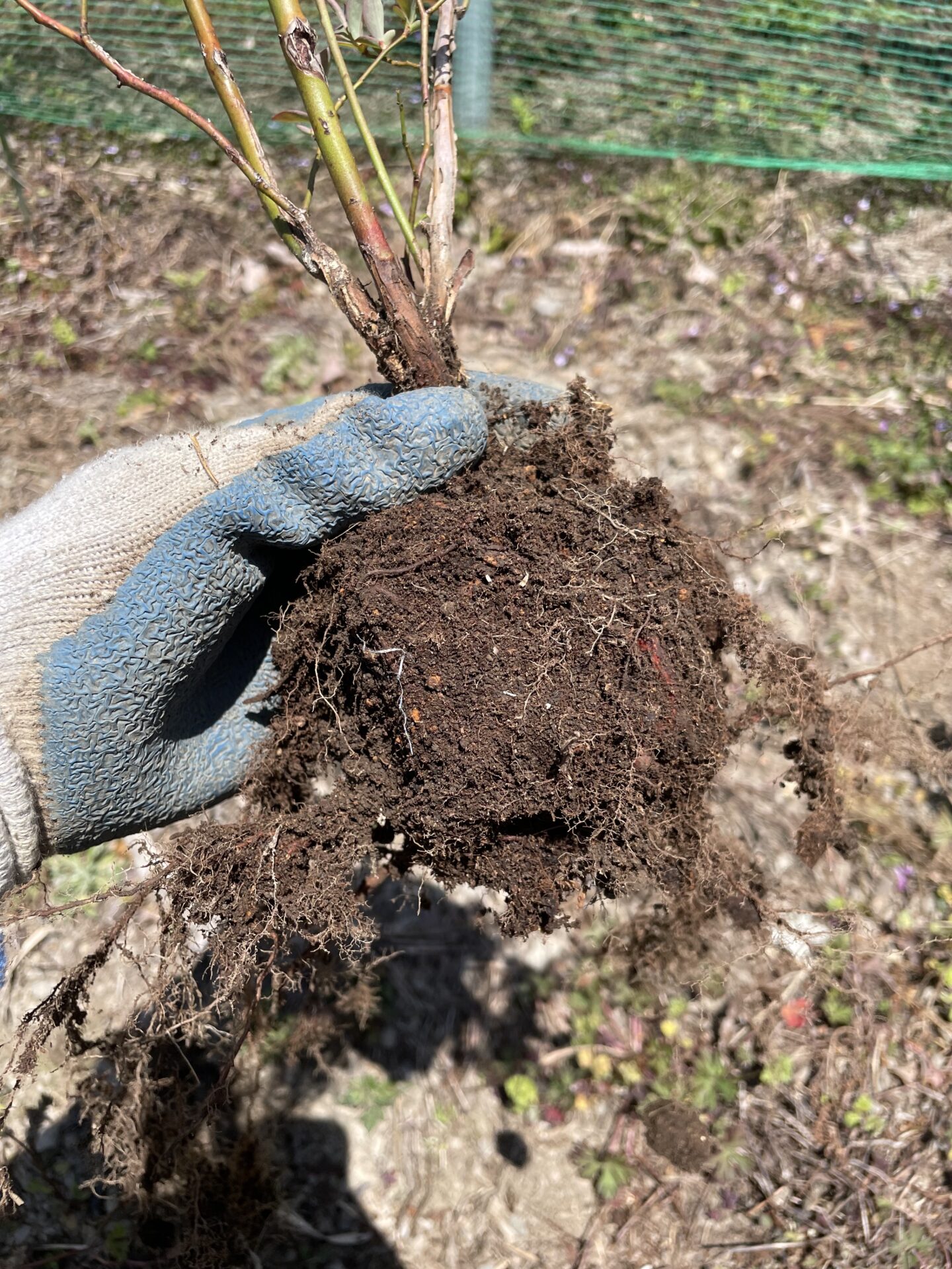 こちらをご覧ください。ほとんど成長していないブルーベリーを掘り起こし、根っこの状態を確認してみました。