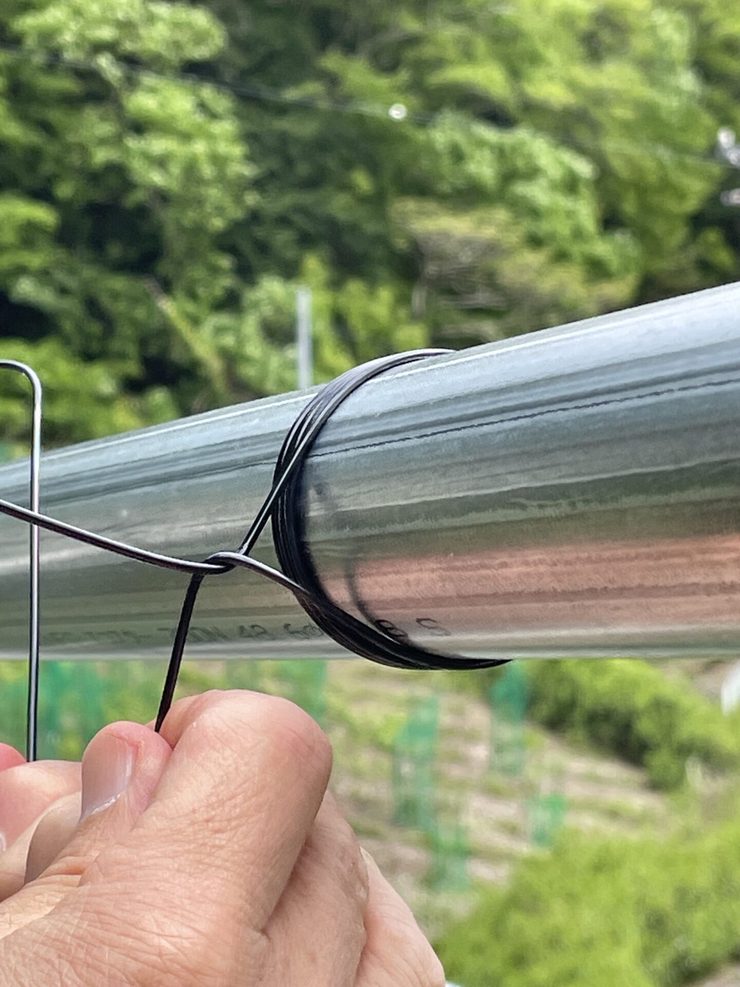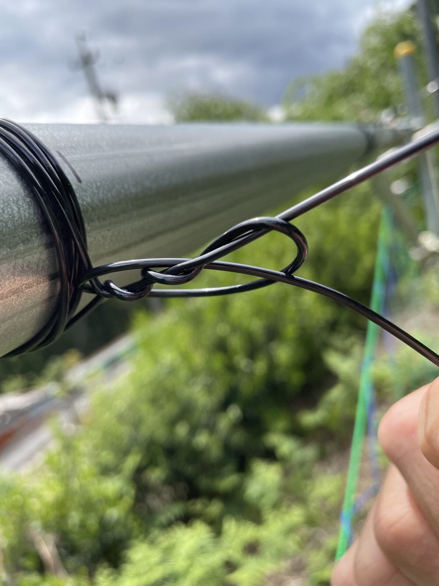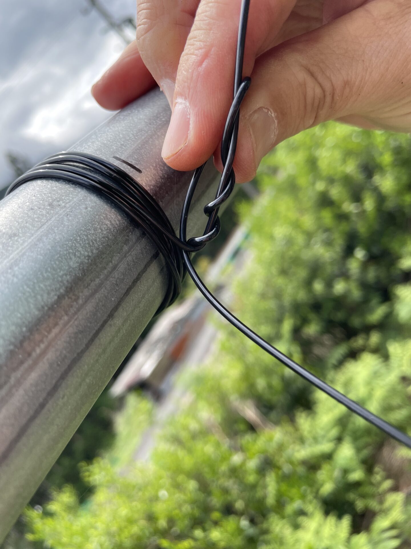 ワイヤーを上に持ってきたら、上の写真のように、張ってあるワイヤーに3回ほど巻き付けていきましょう。