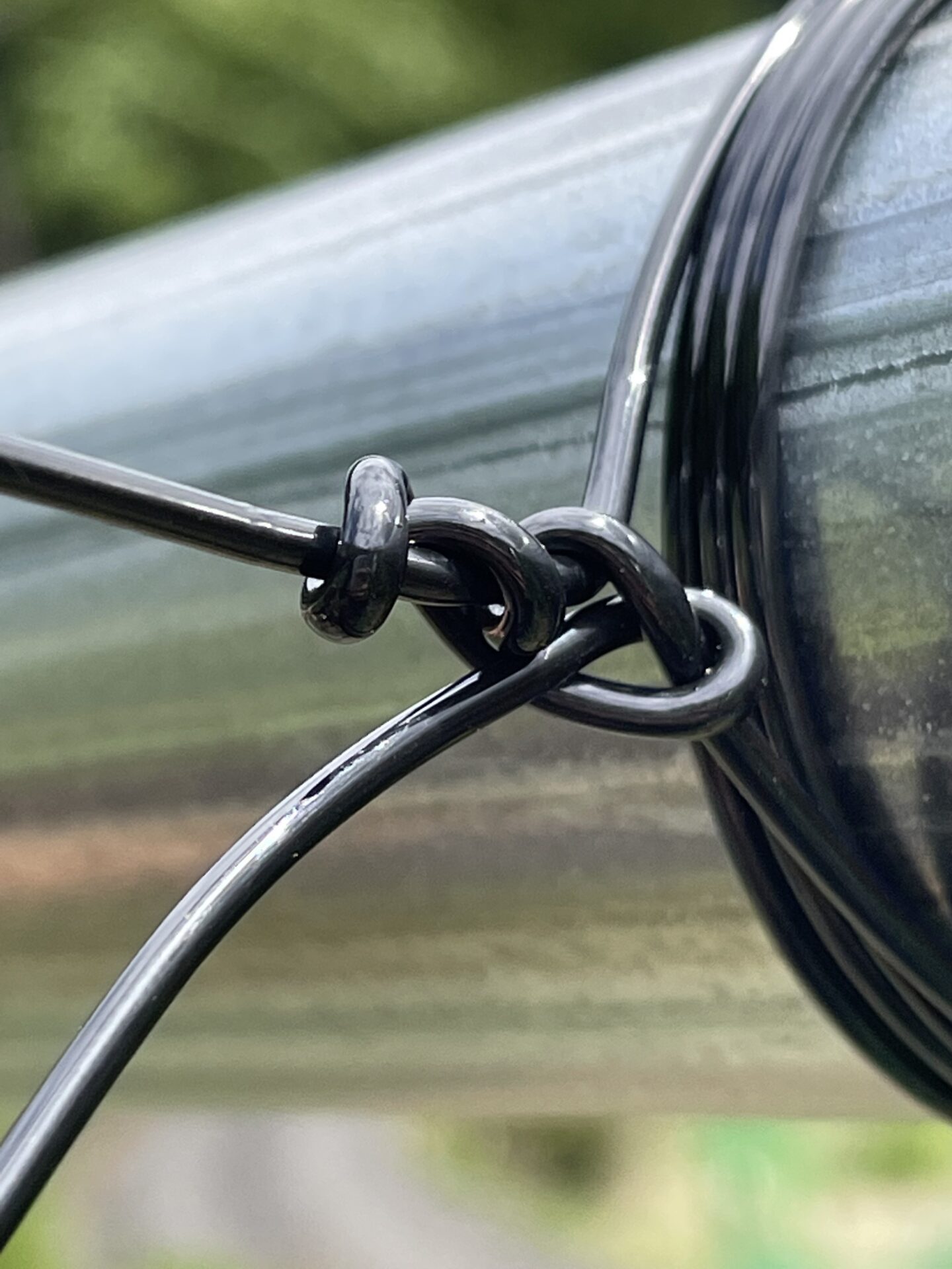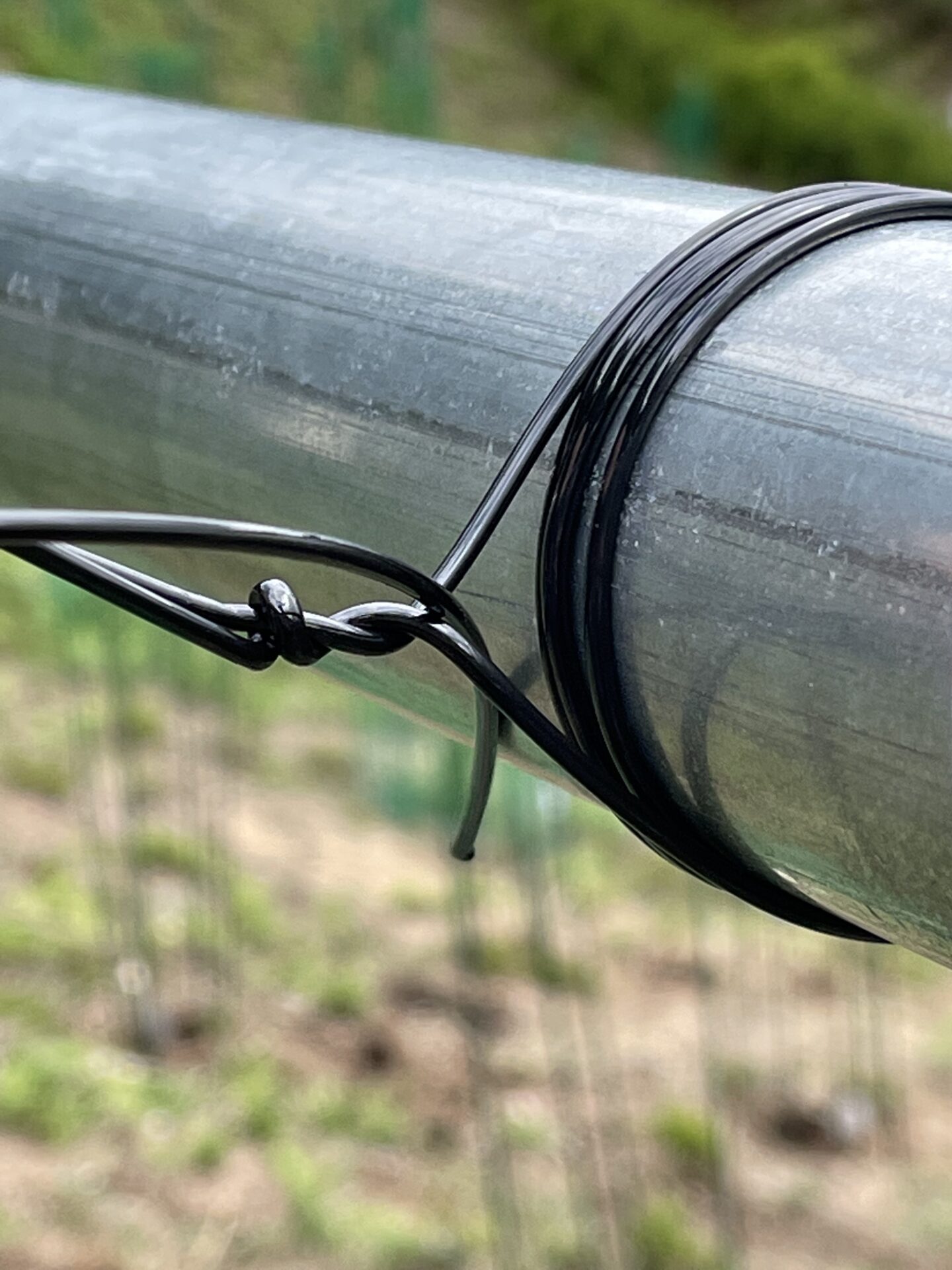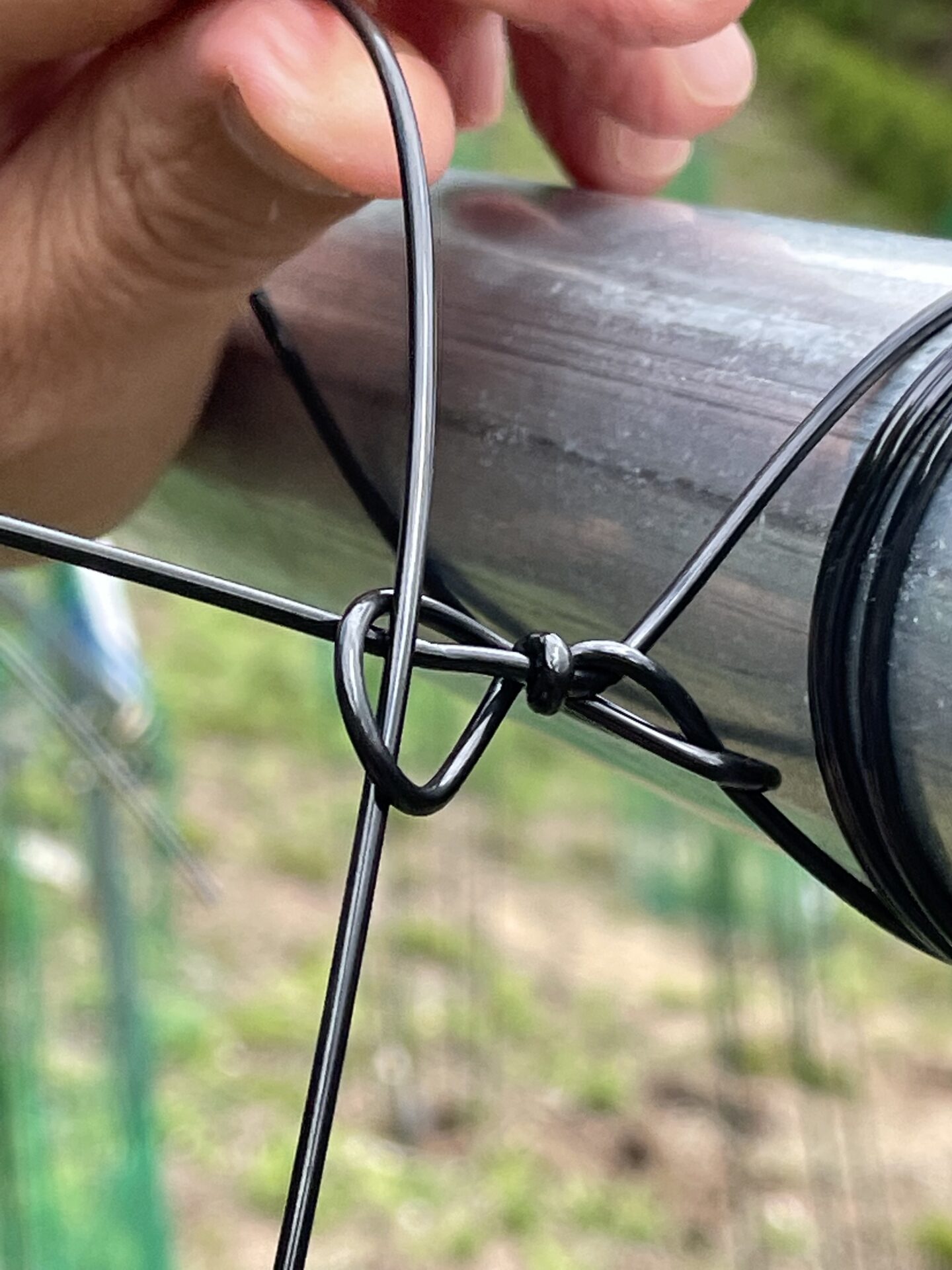 ワイヤーを上に持ってきたら、上の写真のように、張ってあるワイヤーに3回ほど巻き付けていきましょう。