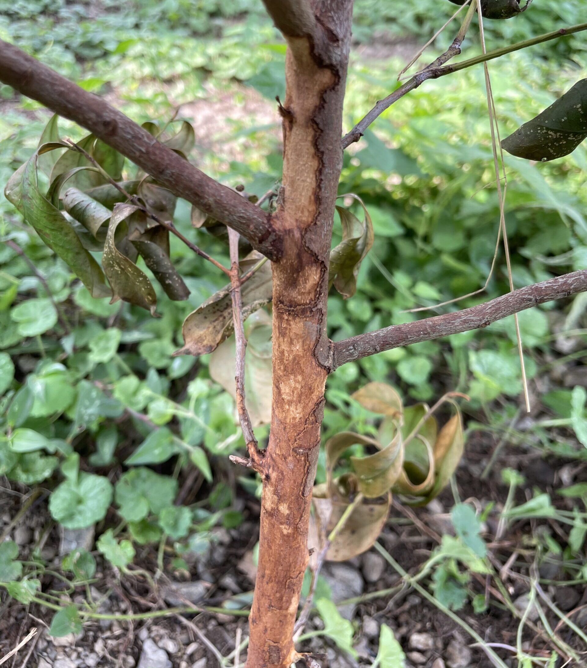 他の虫の可能性もありますが、このように幹を削るのは僕の農園ではカミキリムシ以外確認できなかったため、
