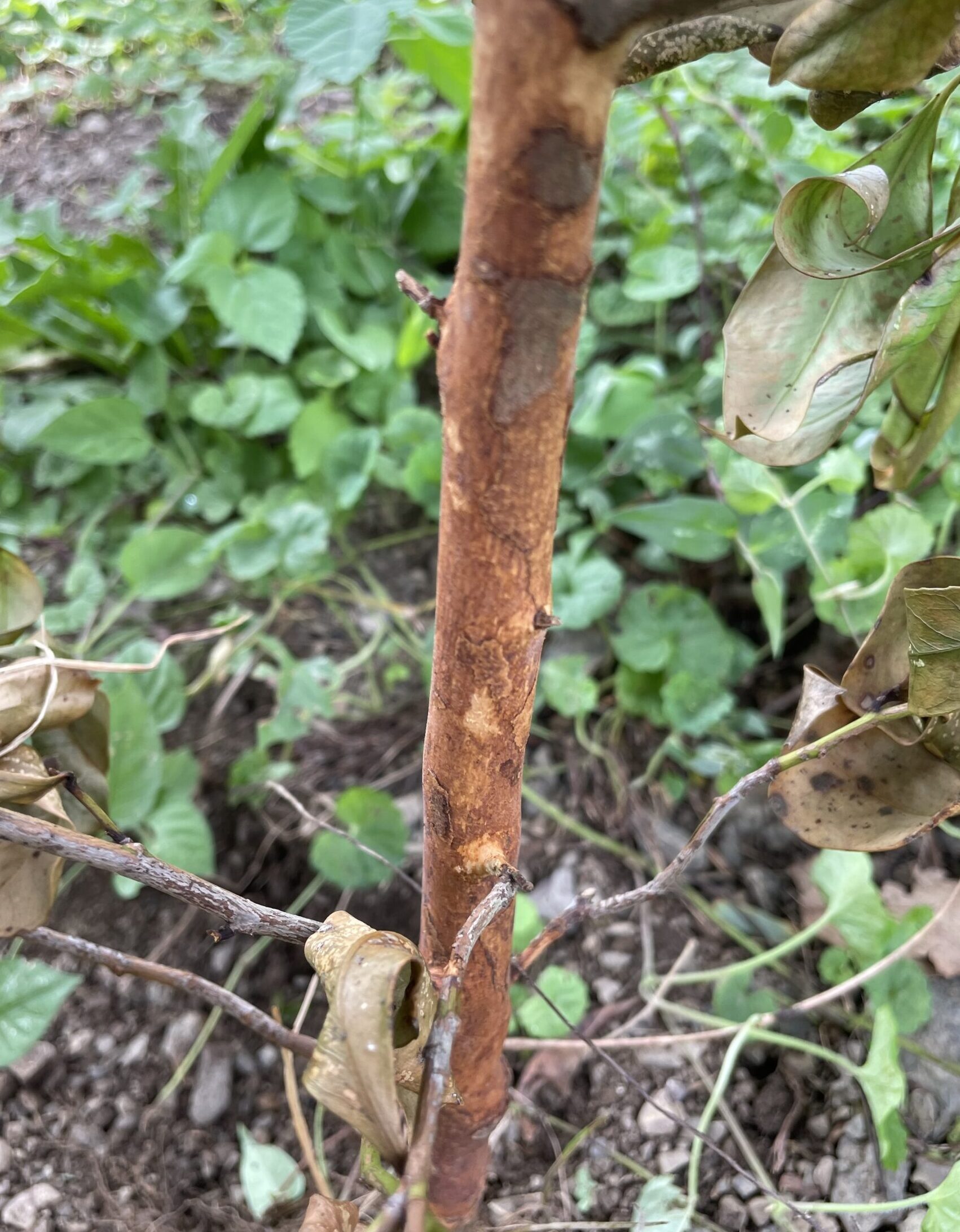 テッポウムシがいる場合、幹の根本におがくずのようなものが落ちていることが多いです。