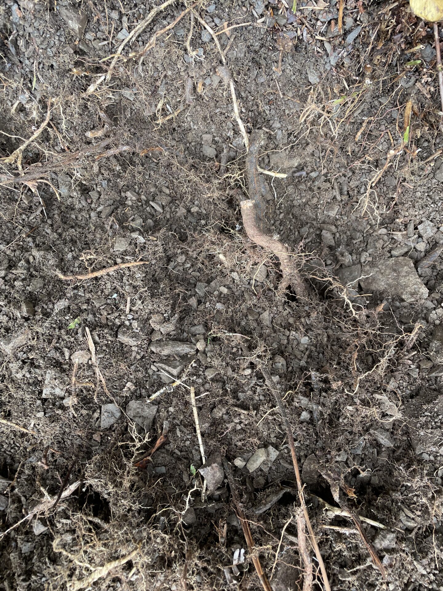 見ての通り、穴を掘っていくと中には雑草やら木々の根っこがたくさんあります。